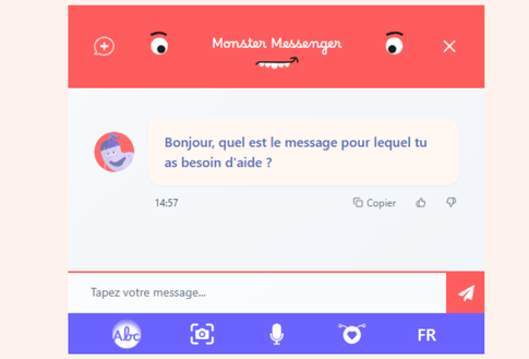 Ce chatbot guide les jeunes afin de réagir à des messages reçus ou vus en ligne sans s’exposer. En cas de cyberviolences, il l’aide à réfléchir à la stratégie à adopter afin de trouver de l’aide. Un chatbot guide les adultes pour prévenir et surmonter des situations de cyberviolences.